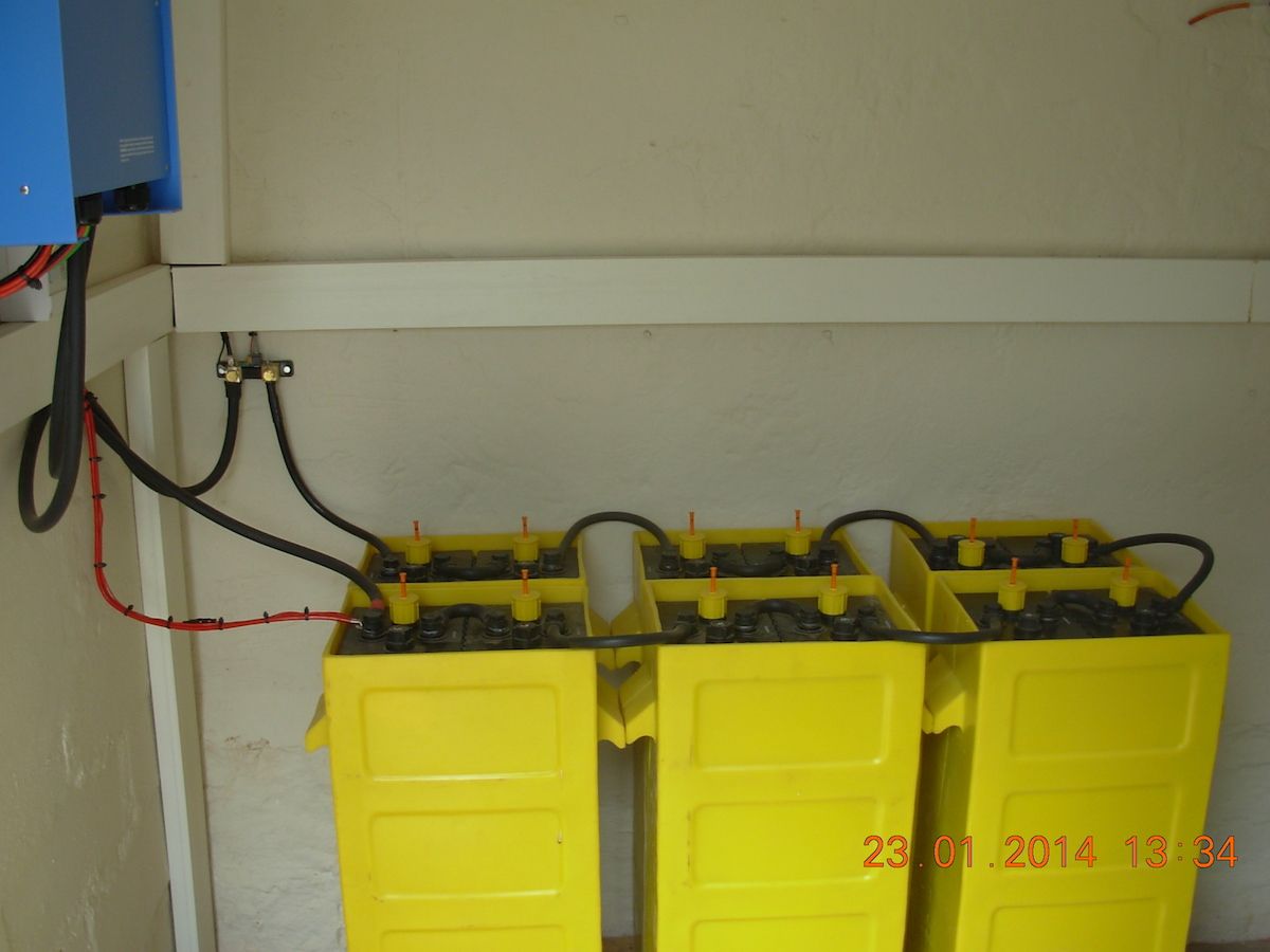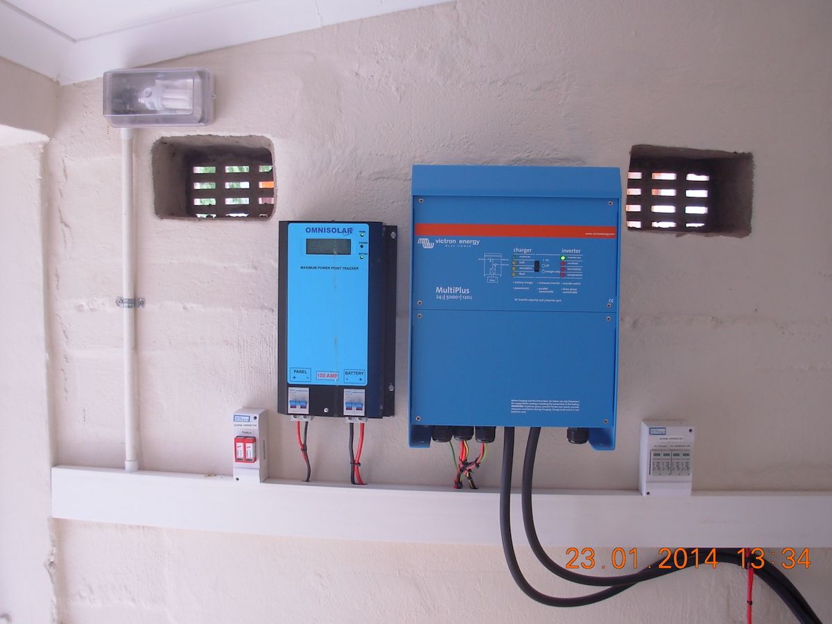 9 x 240 watt solar panels, Steel structure for panels, 100A MPPT charge controller, 12 x 1660 amp/hr 2V deep cycle batteries, 5 Kw Inverter and 50 x 6 watt Philips down lighters, A+ Kelvinator Fridge / Freezer combination, Energy efficient Bosch washing machine.